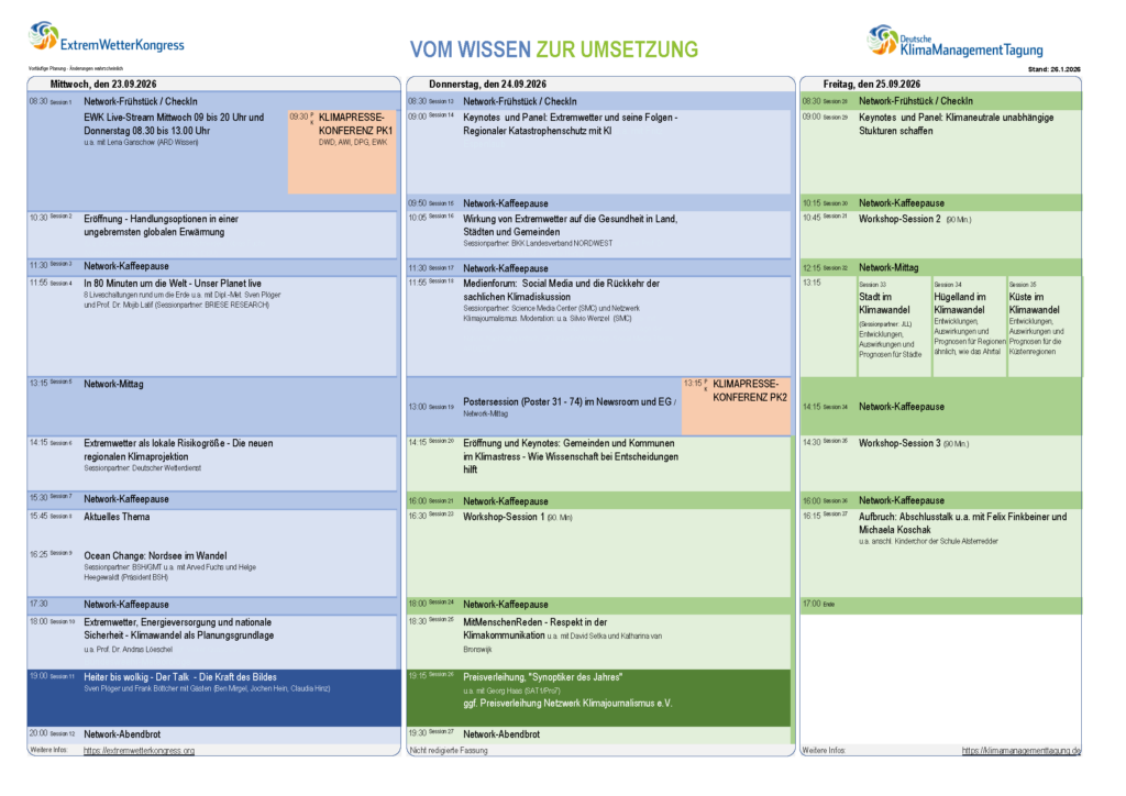 Unmittelbar im Anschluss an den 15. ExtremWetterKongress findet am gleichen Ort die zweite Deutsche KlimaManagementTagung (KMT) mit über 40 Workshops statt. Die Veranstaltungen sind gemeinsam oder getrennt buchbar. Ziel der Kombination ist die Stärkung der Verbindung aus WISSEN und UMSETZUNG. Weitere Informationen finden Sie hier: