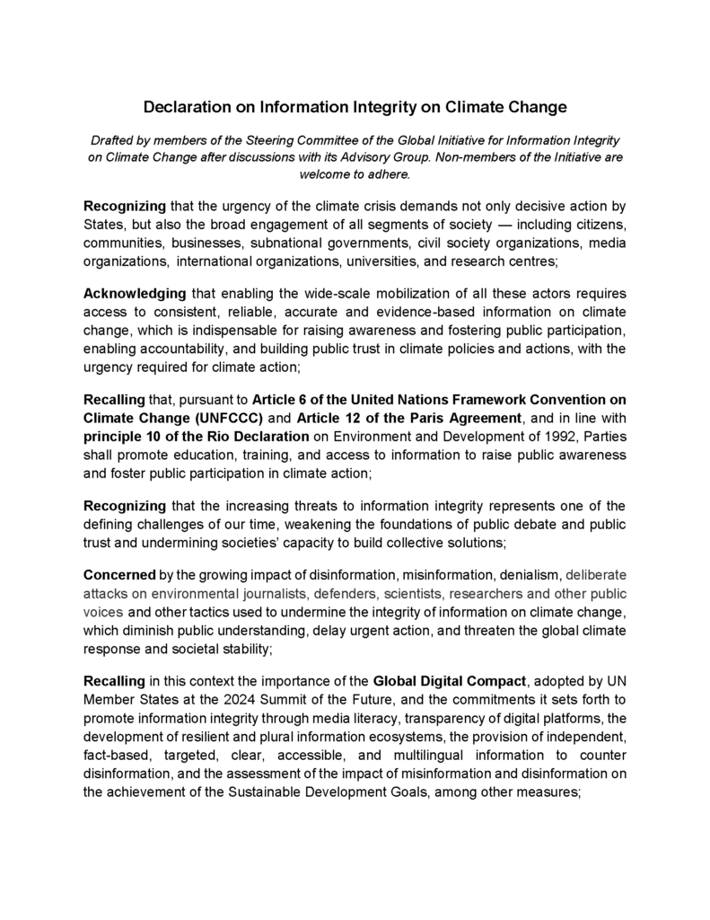 Die Erklärung zur Informationsintegrität im Bereich Klimawandel wurd eauf der COP30 von Belgien,